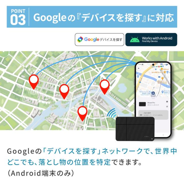 | ご注意事項 | ・Googleの「Find Hub(デバイスを探す)」アプリは名称が変更になる場合がございます。 ・タグと接続したAndroid端末が近くにない場合、タグの周りに3台以上のAndroid端末があることで位置情報がリアルタイム更新されます。 ・Googleの「デバイスを探す」の設定は、デフォルトでは「トラフィックの多いエリアでのみネットワークを使用」の設定が有効になっております。 この場合、デバイスの位置を検出するためには、その付近に“複数の”Androidデバイスがなければなりません。 もしさらに精度を上げたい場合は、Androidの「設定>セキュリティおよびプライバシー>紛失したデバイスを保護>オフライン検出」をONにすることで「すべてのエリアでネットワークを使用」に変更することも可能です。 この設定を有効にすると、人通りが少ないエリアでAndroidデバイスが付近に“1台”あれば位置情報を確認することができます。 ※端末により本設定が存在しない場合がございます。 |