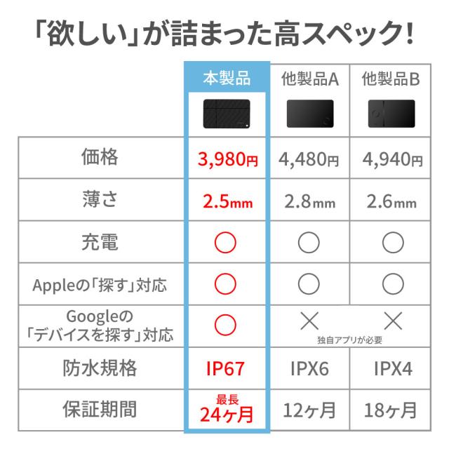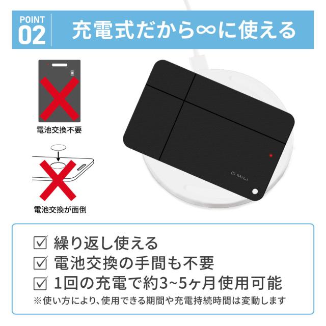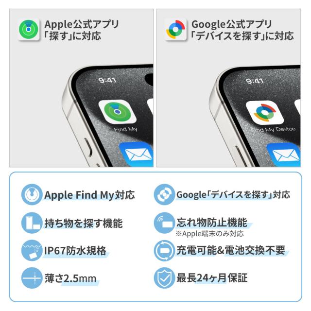 ■Appleの「探す」アプリに対応 iPhone、iPad、Macデバイスの「探す」ネットワークで、世界中どこでも、落とし物の位置を特定できます。 スマホから位置をチェックし、持ち物に近づいた時にスマホでMiCard DUOを鳴らすと、アラートが鳴り位置を特定できます。 持ち物を置き忘れた場合も、持ち物から50m以上離れるとお手持ちのデバイスにバナーで通知が来ます。 【対応機種】IOS14.5 / iPadOS14.5 / macOS12.5以上 例)iPhone13 / iPhone13 mini / iPhone13 Pro / iPhone13 Pro Max / iPhone14/14Plus / iPhone14Pro / ProMax ■Googleの「デバイスを探す」に対応 Googleの「デバイスを探す」ネットワークで、落とし物や迷子、ペットの行方を特定できます。 プライバシー保護機能を搭載しているため、安心してご使用いただけます。 スマホから位置をチェックし、持ち物に近づいた時にスマホでタグを鳴らすと、アラートが鳴り位置を特定できます。 持ち物を置き忘れた場合も、持ち物から50m以上離れるとお手持ちのデバイスにバナーで通知が来ます。 【対応機種】Android9.0以上 ■簡単ワイヤレス充電 電池交換の手間もなく、ワイヤレス充電器に置いて充電するだけでお使いいただけます。 1回の充電で約3〜5ヶ月ご使用いただけます。 ※使い方により、使用できる期間や充電持続時間は変動します。 ※Qi規格対応 ■かさばらない薄さ 薄さわずか2.5mmのため、財布やカードケースに入れてもかさばらずに使用することができます。 ■複数の紛失防止カードを接続可能 複数の紛失防止カードを何台でもデバイスに追加できるため、家族分のカードケースや財布などの持ち物に入れて使うことができます。 ■大音量ブザー搭載 大音量のブザーにより、クッションなどに隠れていても見つけ出すことができます。 ■技術基準適合証明(技適)取得済み 技術基準適合証明番号:R214-126021 本製品は日本での技術基準適合証明(技適)を取得しています。 技適証明を取得していない商品を日本国内で使用する場合、電波法違反になる恐れがございます。技適証明取得をしている製品のご購入、ご使用を推奨いたします。 ※製品やパッケージへの技適マーク記載は任意のため、本製品には記載がございません。技適証明取得をご確認されたい場合は、総務省 電波利用ホームページよりご確認ください。 |