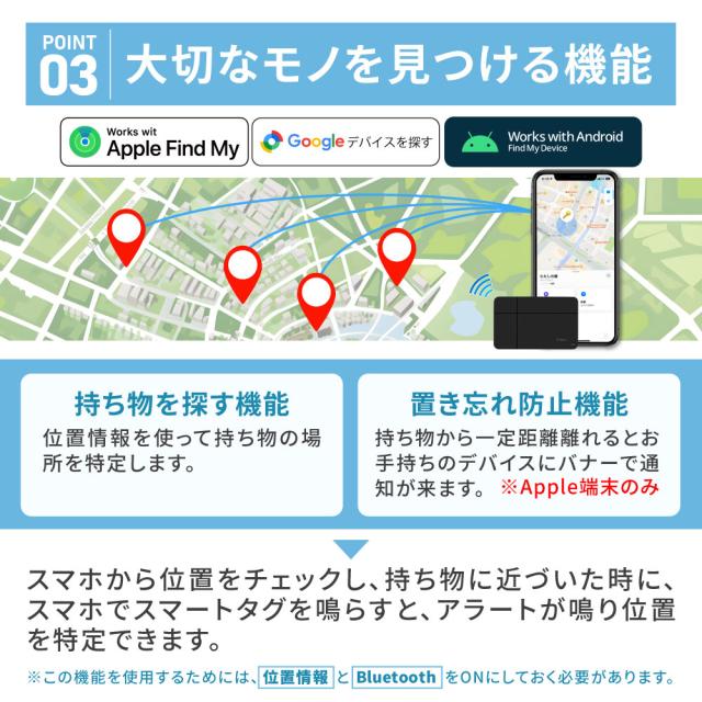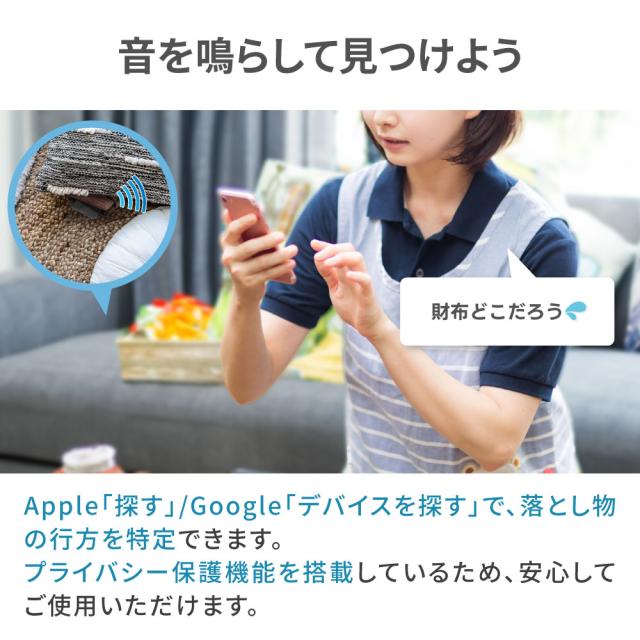 iOSは「探す」、AndroidはGoogleの「デバイスを探す」アプリに対応した紛失防止タグです。 それぞれApple、Googleが提供するアプリを利用するため、これまでのタグに比べて探す精度がグッと上がりました! 何台でもデバイス接続が可能など機能面も充実しています。 Bluetoothを利用して財布、カードケース、パスポートケースなどに入れて失くし物を失くします! |