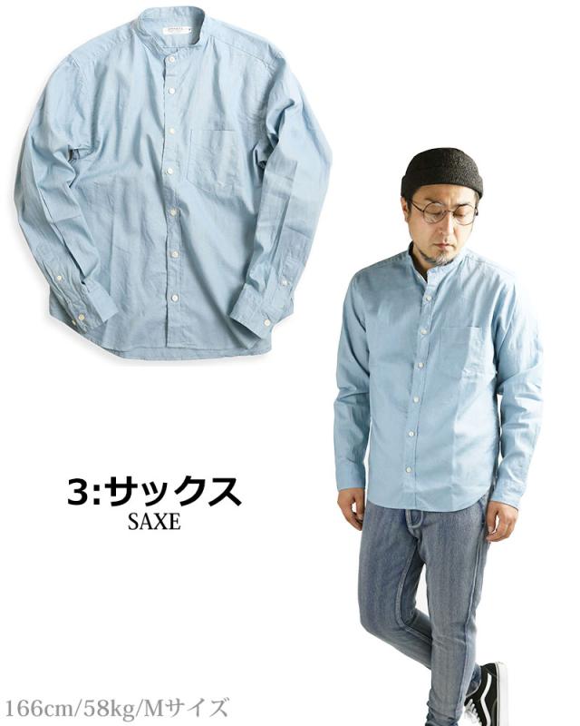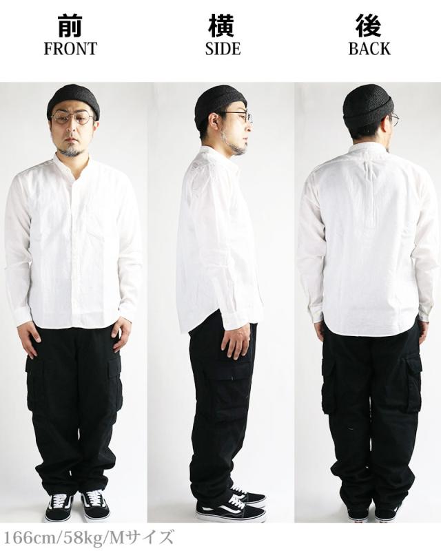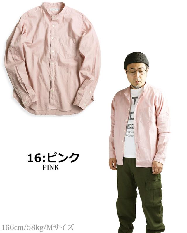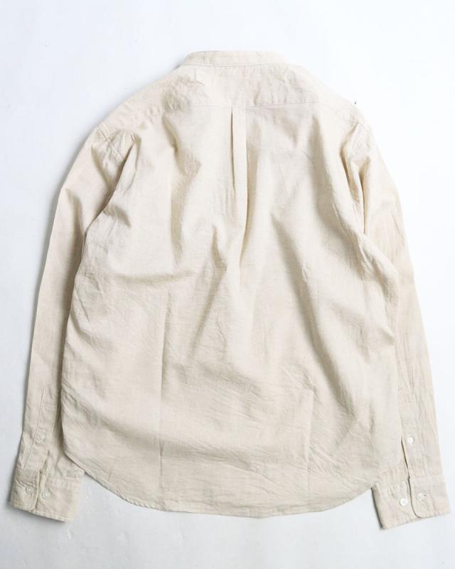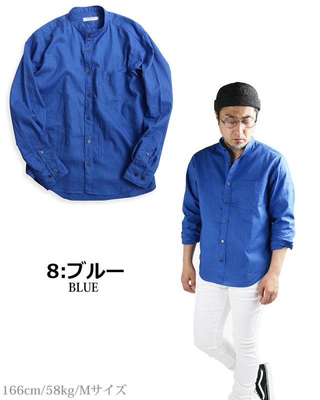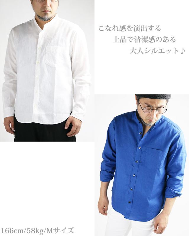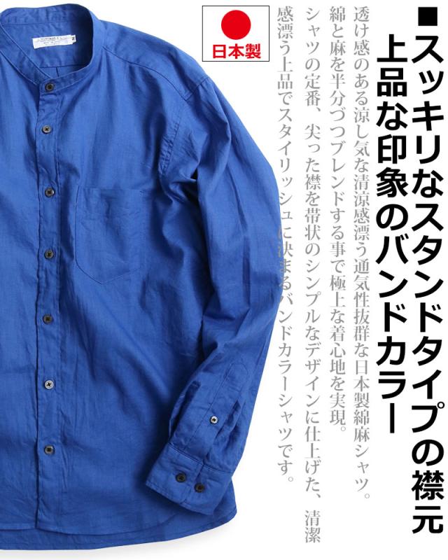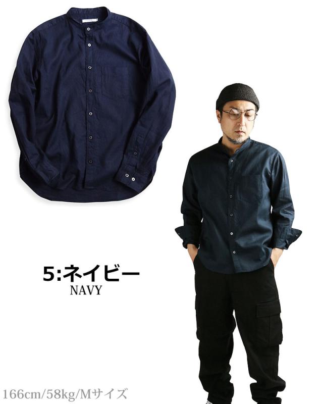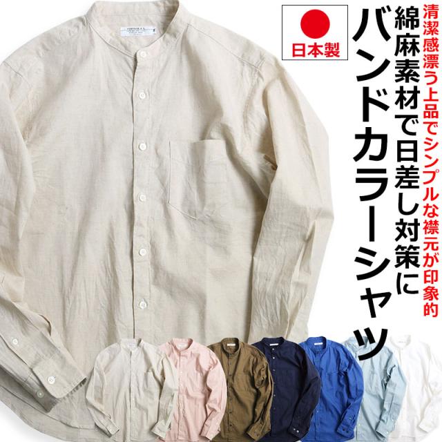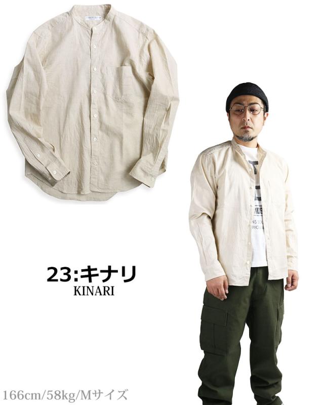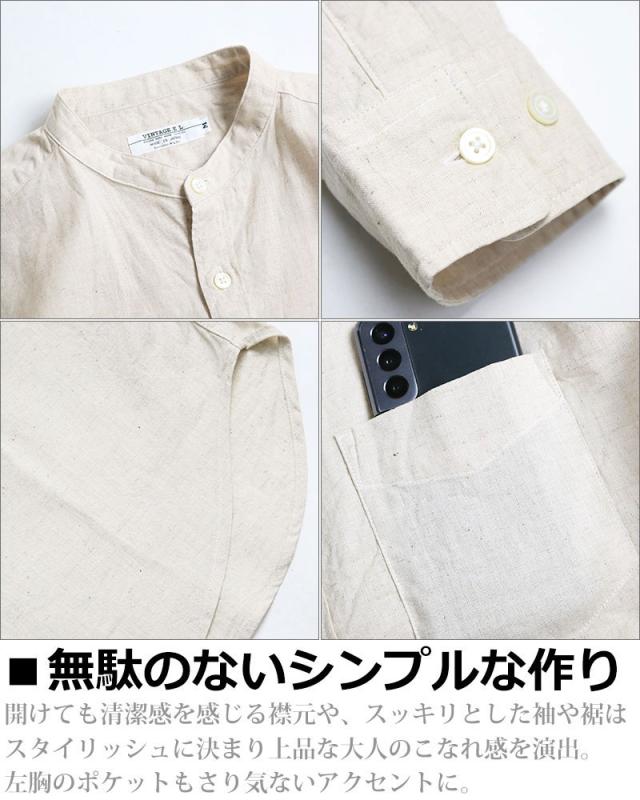 日本製 VINTAGE EL バンドカラー コットン リネンシャツ 綿麻シャツ スタンドカラー 襟なし 無地 長袖シャツ