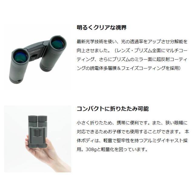 小さく折りたため、携帯に便利です。また、狭い眼幅に対応できるためお子様でも使用することができます。 本体ボディは、軽量で堅牢性を持つアルミダイキャスト採用。308gと軽量化を図っています。