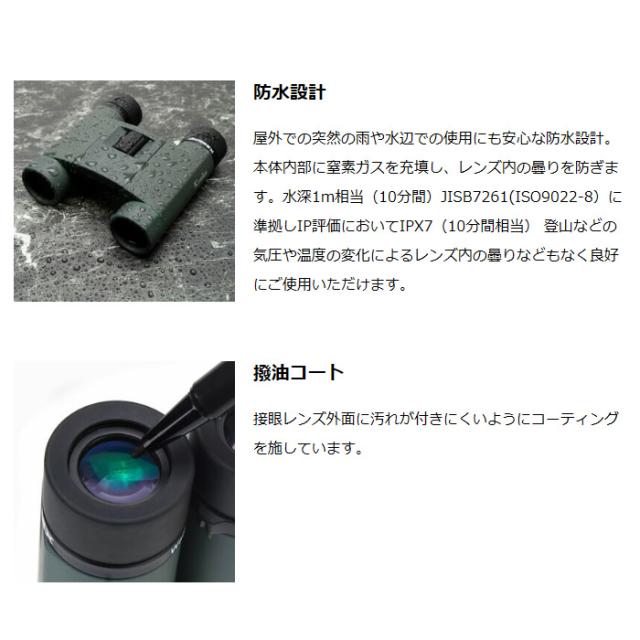 屋外での突然の雨や水辺での使用にも安心な防水設計。本体内部に窒素ガスを充填し、レンズ内の曇りを防ぎます。水深1m相当(10分間)JISB7261(ISO9022-8)に準拠しIP評価においてIPX7(10分間相当) 登山などの気圧や温度の変化によるレンズ内の曇りなどもなく良好にご使用いただけます。