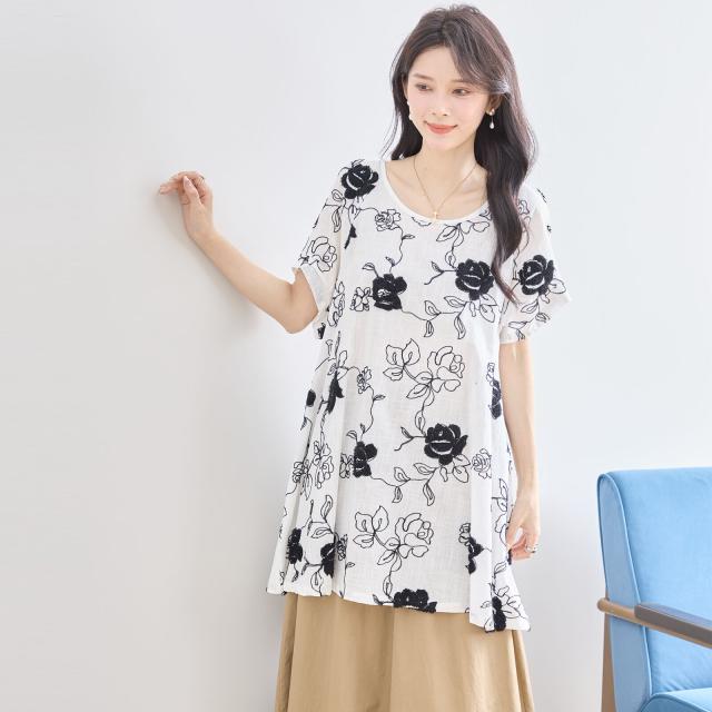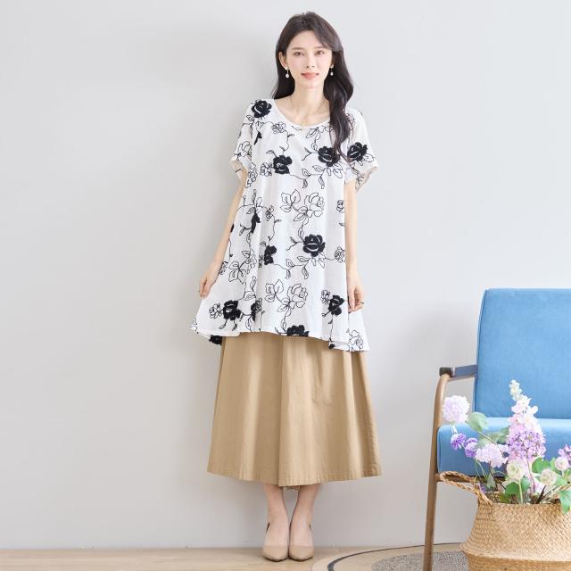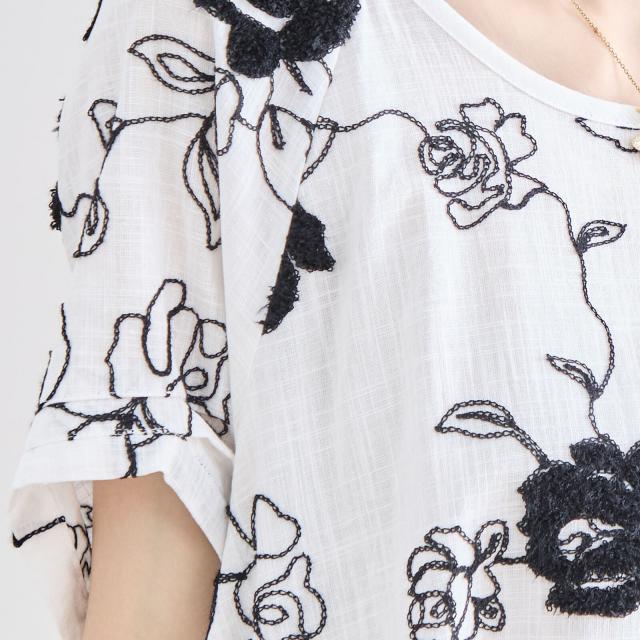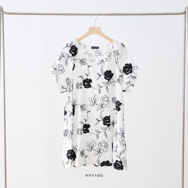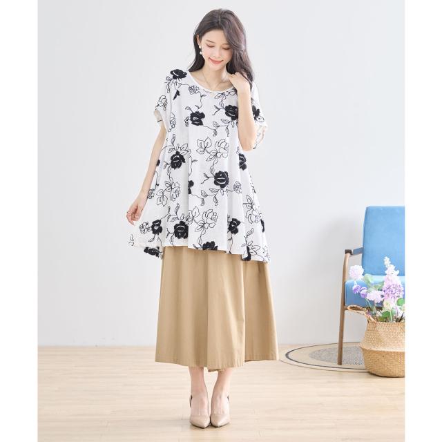 【即納】モノトーン花柄刺繍コットンチュニック トップス 半袖 綿100% お尻カバー 体型カバー きれいめ 春夏 新作