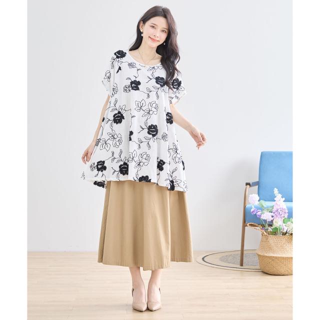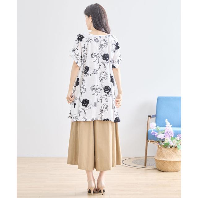 大きな花柄のシルエット刺繍が印象的なチュニックトップス。たっぷりとしたAラインシルエットが、女性らしい柔らかさと涼やかな印象を演出します。風をはらむ軽やかなコットン100%素材で、春夏にぴったりの爽やかな着心地。ゆったりとした身幅とドロップショルダーでリラックス感もありながら、華やかで着映えする一枚です