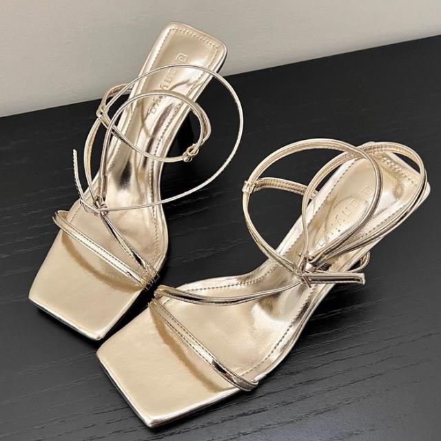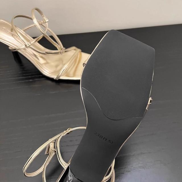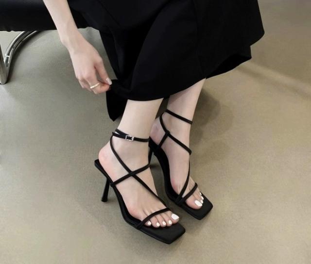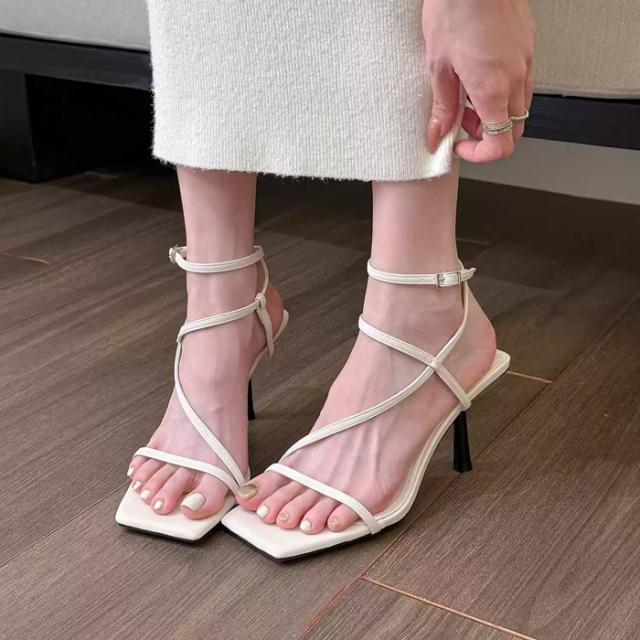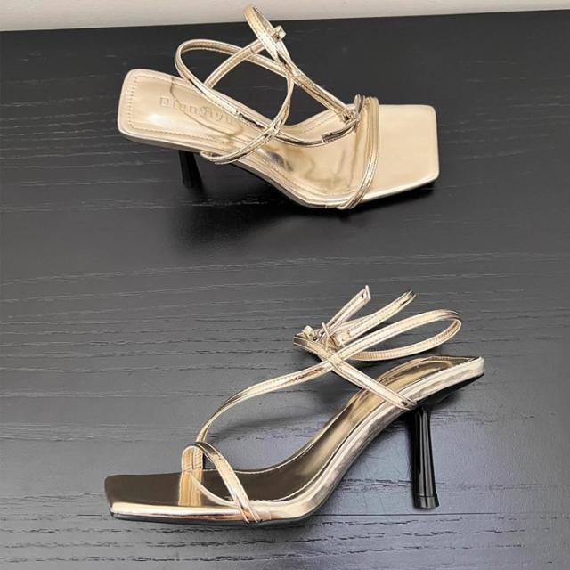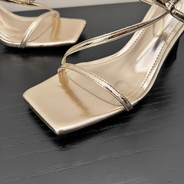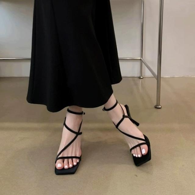 ストラップサンダル レディース ピンヒール 脱げない 痛くない 歩きやすい アンクルストラップ かかと付き カジュアル きれいめ おしゃれ 春 夏 スクエアトゥ 細ストラップ コードストラップ ナローストラップ アンクルストラップ ブラック 黒 シルバー ホワイト