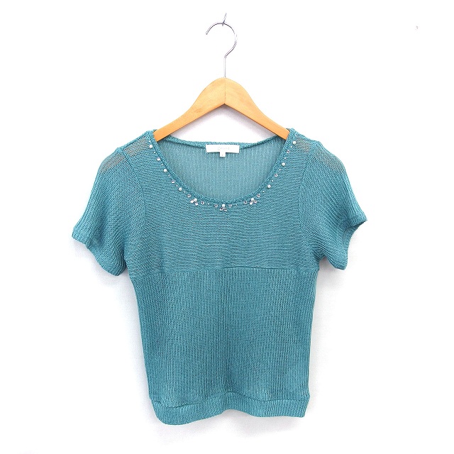 【中古】グローブ grove サマーニット セーター 丸首 ビジュー 透け編み 半袖 L グリーン 緑 /TT レディース