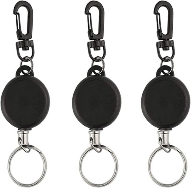 リールキーホルダー(3個セット/黒/ABS) カラビナ付 リールストラップアクセサリー 伸縮自在 紛失防止 キーホルダー 釣りのボタン ウェビングのバックル アウトドア用