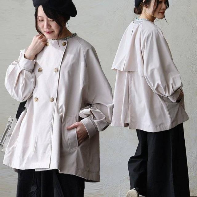 コート ショート トレンチコート ショート丈 レディース ノーカラー ポリエステル 無地 裏地付き 袖バルーン 大きいサイズ 体型カバー カジュアル パティ