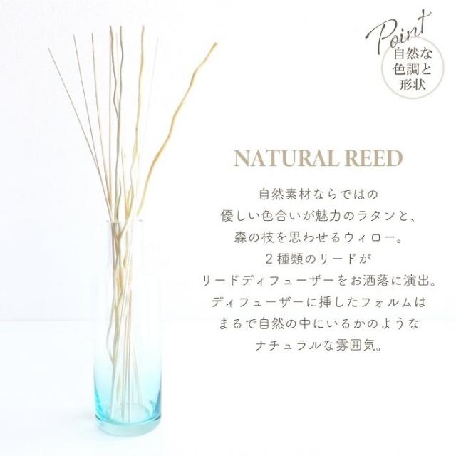 自然素材ならではの優しい色合いが魅力のラタン(籐)と森の枝を思わせるウィロー(柳)、2種類のリードがリードディフューザーをオシャレに演出。ディフューザーに挿したフォルムは、まるで自然の中にいるかのようなナチュラルな雰囲気。