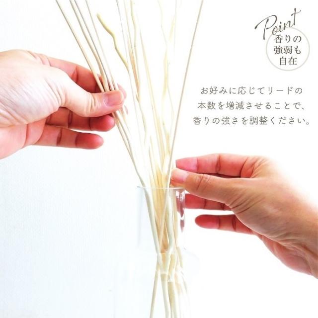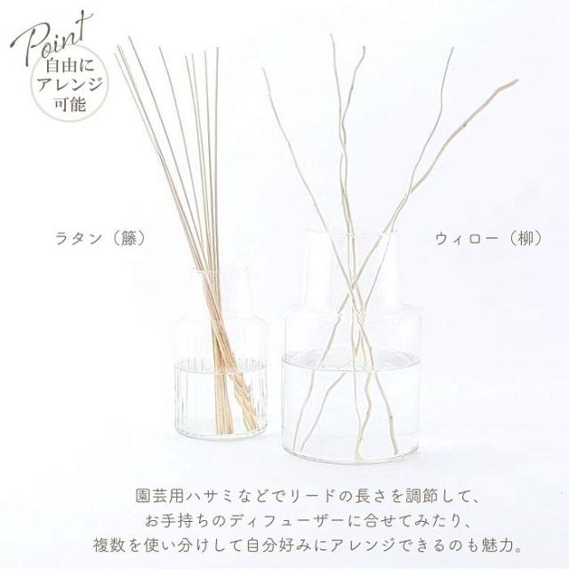 園芸用ハサミなどでリードの長さを調整して、お手持ちのディフューザーに合わせてみたり、計15入りなので複数を使い分けして自分好みにアレンジできるのも魅力。お好みに応じてリードの本数を増減させることで、香りの強さを調整ください。