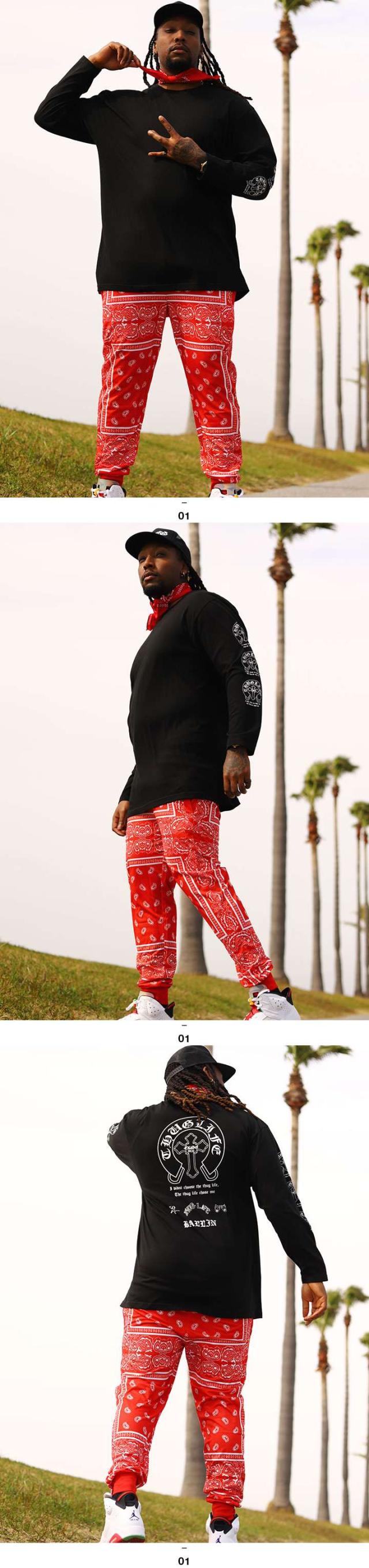 送料無料 L-2XL おしゃれ かっこいい メンズセットアップ Thug Life 2pac トゥーパック ペイズリー柄 バンダナ柄 赤いバンダナ 赤バンダナ 赤ペイズリー ジョガーパンツ イージーパンツ