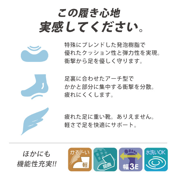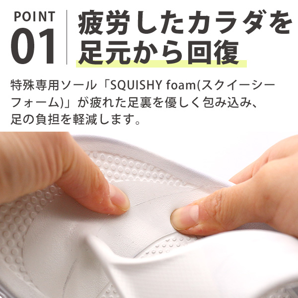 特殊専用ソール「SQUISHY foam(スクイーシーフォーム)」が疲れた足裏を優しく包み込み、足の負担を軽減します。足裏に合わせたアーチが踵部分に集中する衝撃を分散させ、足を疲れにくくします。疲れた足に重い靴はありえません。おどろきの軽さで足を快適にサポートします。
