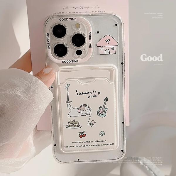 かわいい猫インピンクカードパッケージバッグ漫画音楽クール電話ケース iphone 14 15 プラス 11 12 プロマックス 13 プロマックスカバー