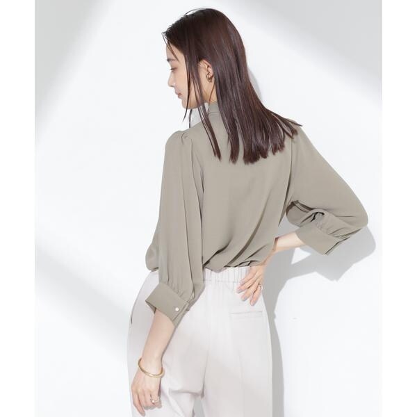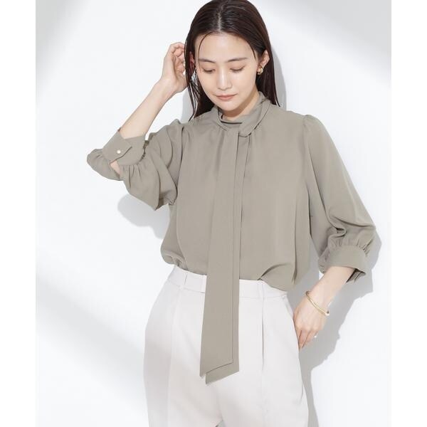 オフィス映えするボウタイ付きのとろみブラウス。上品なスタンドカラーに、ふんわりとしたボリュームスリーブが女性らしさを高めるデザイン。ボウタイの有無で印象をチェンジできるから、ワードローブに追加しておくとコーディネートの幅が広がりそう!