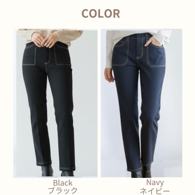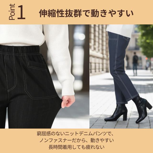 【パンツ脚幅】 スタンダード【素材】 綿・コットン:30% ポリエステル:65% ポリウレタン:5%【裾の長さ(丈)】 10分丈【柄】 無地【生産国】 中国【テイスト(ファッション)】 カジュアル【洗濯表示】 家庭洗濯【ウェストの締め方】 ゴム【シーズン】 春夏:起毛ナシ 秋冬:起毛アリ【カラー】 ブラック ネイビー 【スタイル(パンツ)】 イージーパンツ ワークパンツ【商品説明】 こちらのワークパンツは、ニットデニム 裏起毛ナシ 通年用 母の日 ギフトこの、ストレッチデニムは、窮屈感のないニットデニムパンツで、ノンファスナーだから、立ったり座ったり、スイッツと、らくらくできます。ストレッチデニムなので、総ゴムでお腹ラク、ストレッチで、よく伸びるキレイ目、ストレートパンツ。このストレッチワークパンツは、やわらかくふわふわなはき心地。通年用 カラー ブラックなんにでも、合わせやすいブラック。ストレッチデニムで、スタイルアップ。このストレッチワークパンツは、カラー ネイビー通年用裏起毛ナシ本物のデニムのような仕上がり!
