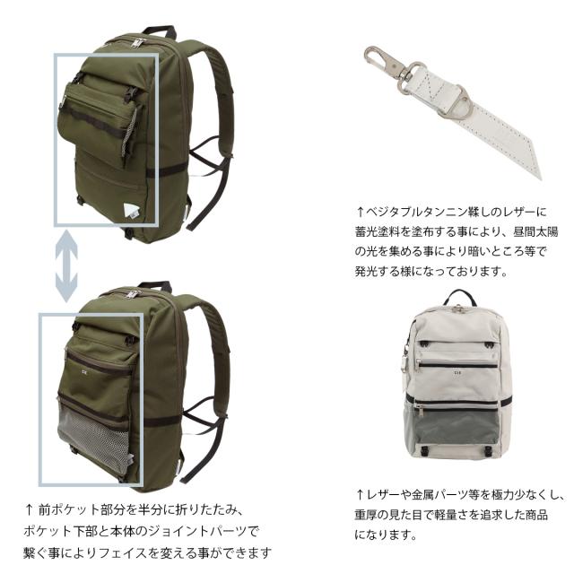 機能性も兼ね備えた商品となっております。付属のキーホルダーとコラボレーションネームにはベジタブルタンニン鞣しのレザーに蓄光塗料を塗布する事により、昼間太陽の光を集める事により暗いところ等で発光する様になっております。レザーや金属パーツ等を極力少なくし、重厚の見た目で軽量さを追求した商品になります。
