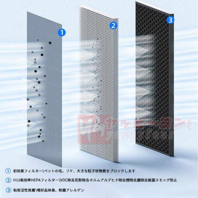 花粉・細菌除去 6重清浄力:除菌ライト付き、活性炭フィルター、静電HEPAフィルター、ナノ銀フィルター、集塵フィルターと防塵網搭載、