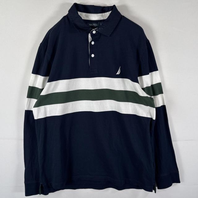 古着 ノーティカ NAUTICA 長袖シャツ ポロシャツ ワンポイントロゴ刺繍 マルチカラー ボーダー 大きいサイズ XL ネイビー メンズ