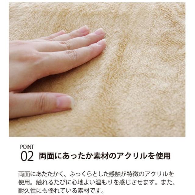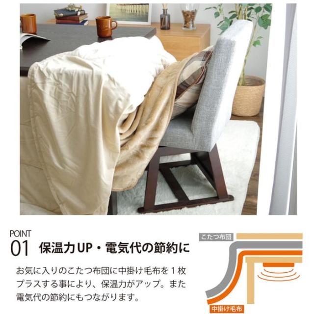 両面にあったか素材のアクリルを使用した高脚用のこたつ中掛け毛布です。あたたかく、ふっくらとした感触があり、耐久性にも優れています。掛け布団とこたつ台の間に入れれば、保温性のアップと電気代の節約にも効果があります。