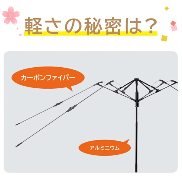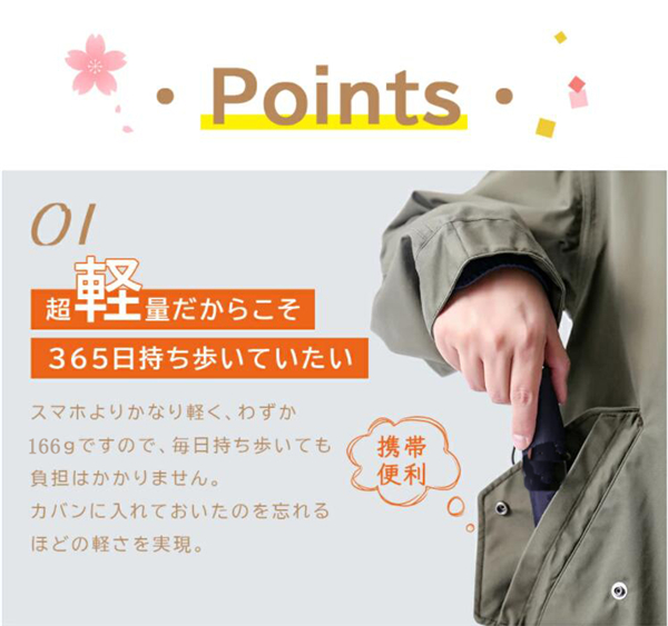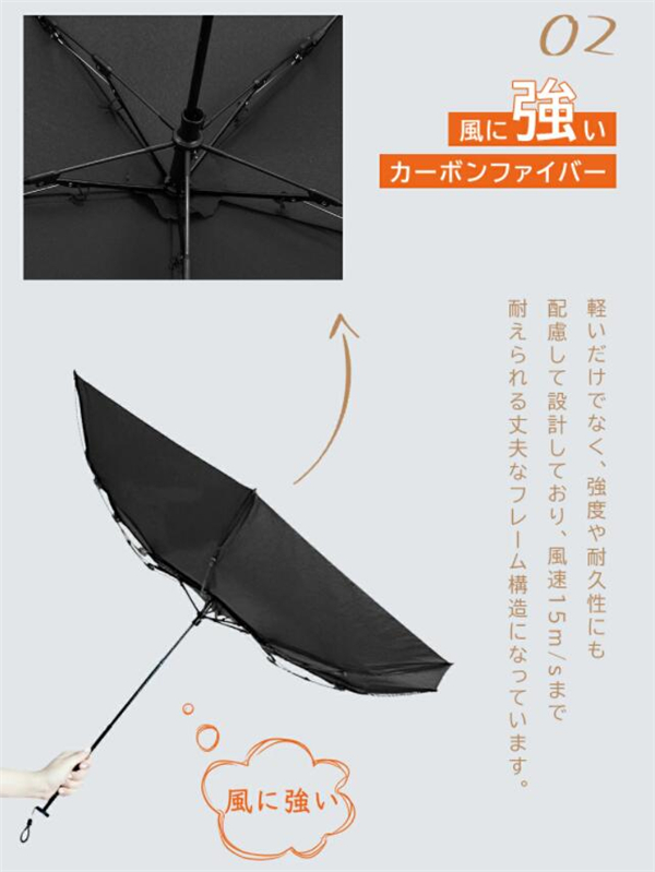 高級傘にしか使わないカーボンファイバーを使用しました!親骨50、直径88cmの大きさなのに重さはわずか166gです!突然の雨や思わぬ日射しに大活躍してくれます。スマホの1/3ぐらいの重さなので、毎日持ち歩いても負担かかりません。
