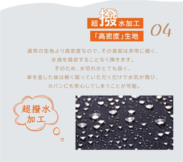 細く強い糸で織り上げることにより、優れた撥水力を維持しながら薄く軽く改良することが出来ました。通常の生地より高密度なので、その表面は非常に細く、水滴を吸収することなく弾きます。そのため、水切れがとても良く、傘を差した後は軽く振っていただくだけで水気が飛び、カバンにも気楽にしまうことが可能。