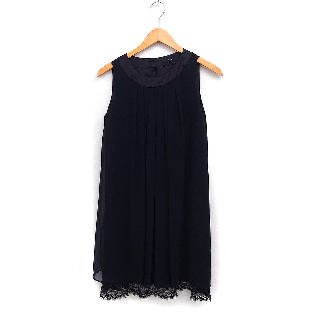 【中古】コムサイズム COMME CA ISM シフォン ギャザーワンピース ドレス ひざ丈 ノースリーブ レース 無地 M ブラック