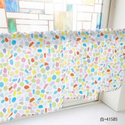 商品詳細:様々な色や形のタイルがたくさん描かれているおしゃれなカフェカーテンです。 生産国:日本 素材・材質:ポンジ 商品サイズ:W1000×H450mm