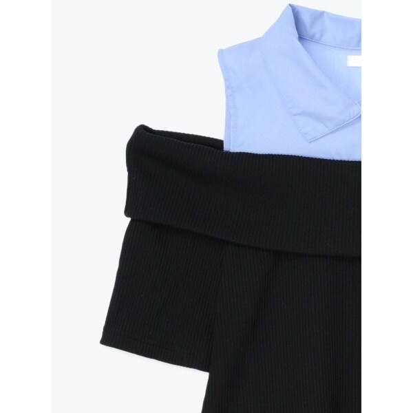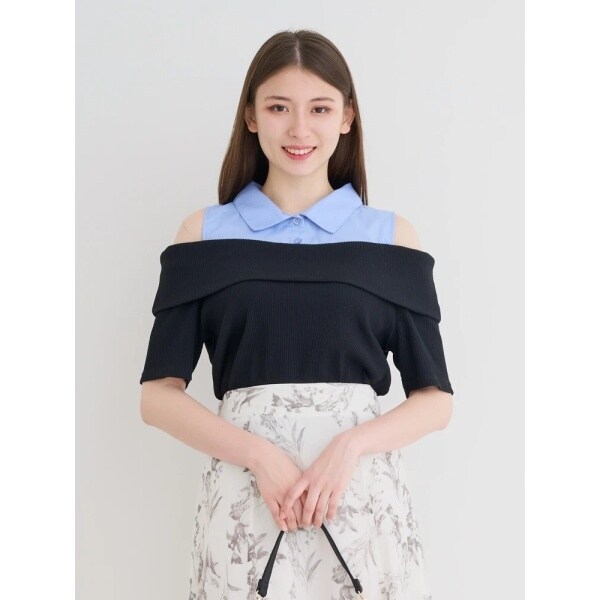 ・レイヤード風に仕上げたシャツドッキングデザインのオフショルトップス。