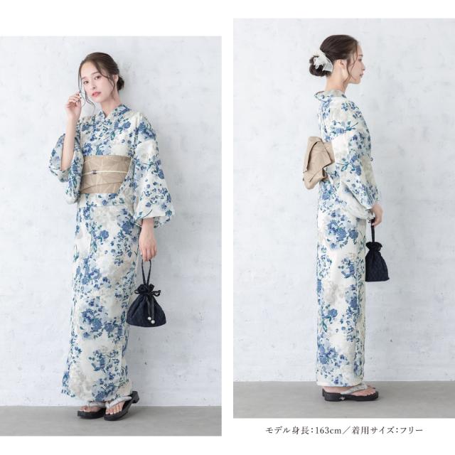 浴衣 セット レディース 浴衣セット 半幅帯 floro グレー 青 紺 ベージュ あじさい 花柄 涼しい おしゃれ かわいい 下駄 Sサイズ フリーサイズ 送料無料