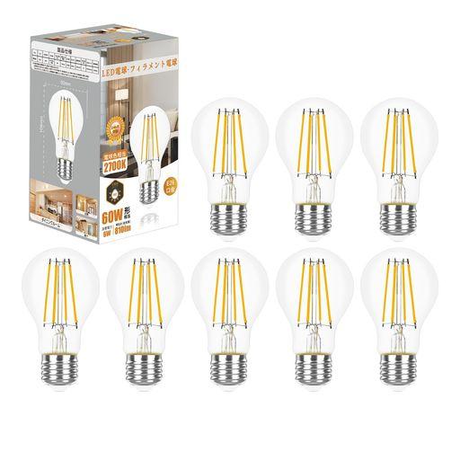 LED電球 E26口金 60W形相当 電球色 810ルーメン フィラメント電球 クリア 全方向タイプ 一般電球形 調光不可 省エネ 8個入り