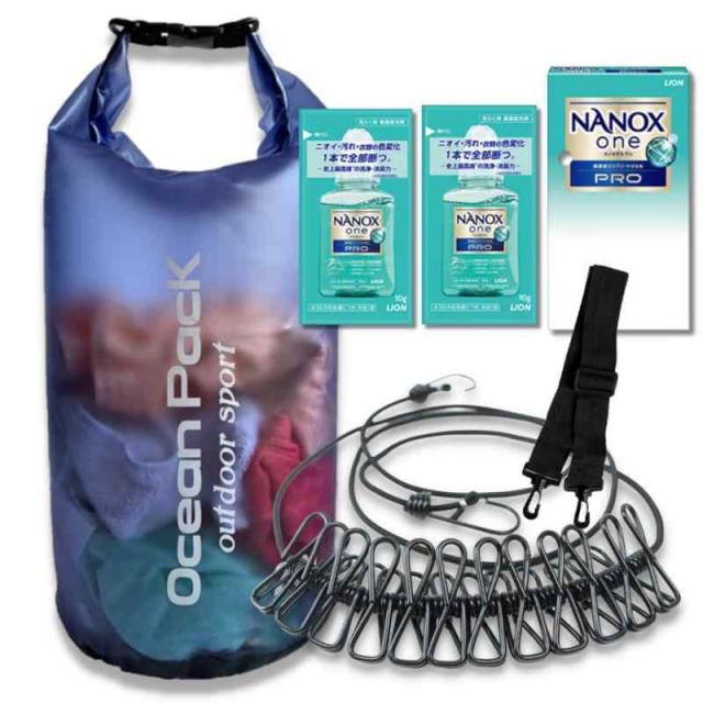商品内容【洗濯袋20L・洗濯ばさみ付き物干しロープ・ナノックス液体洗剤10g×2パック・リュックになる紐・日本語説明書】