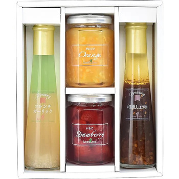 商品内容:ジャム(オレンジマーマレード・いちご)各145g×1、ドレッシング(フレンチガーリック・和風しょうゆ)各122ml×1
