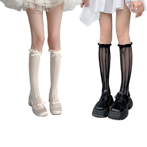 ハイソックス レディース 2足セット ニーハイソックス ロリ系 美脚 ひざ下 靴下 可愛い 通学 通勤 旅行 通気性 女子高生制服用 レースソ