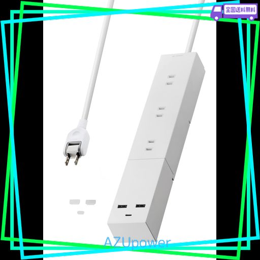 エレコム 電源タップ 雷ガード USBタップ 2.5M 3個口 USB 32W [ USB-A 2ポート/ USB-C 1ポート ] 充電器 倒れにくく吊り下げ可能な脚パーツ付き USBポート用キャップ付き ホワイト ECT-23325WH