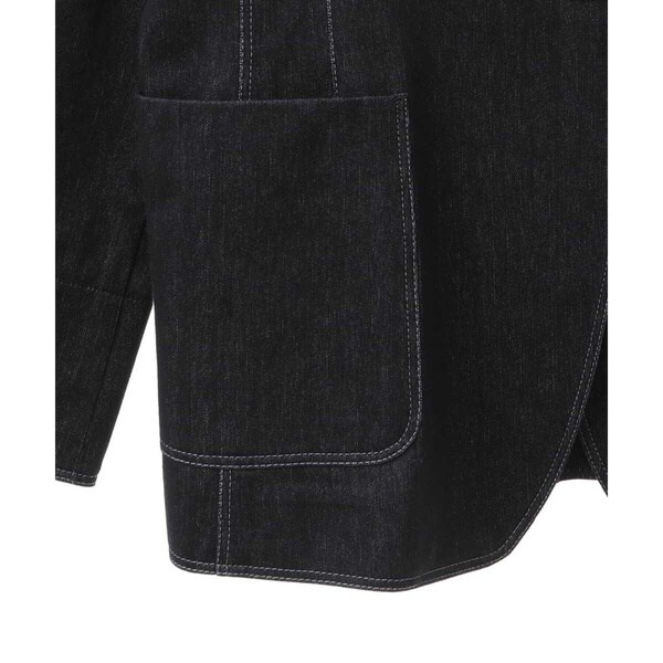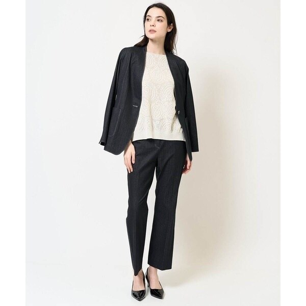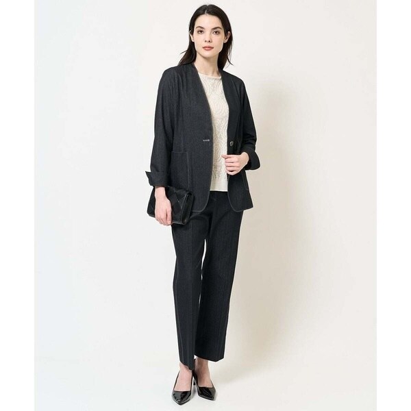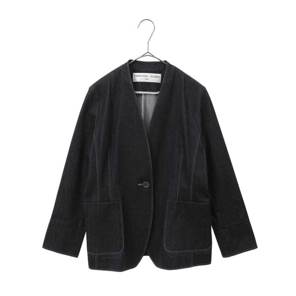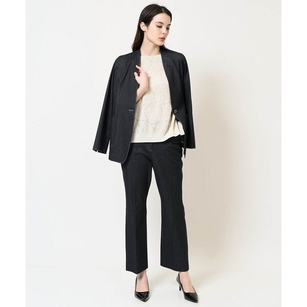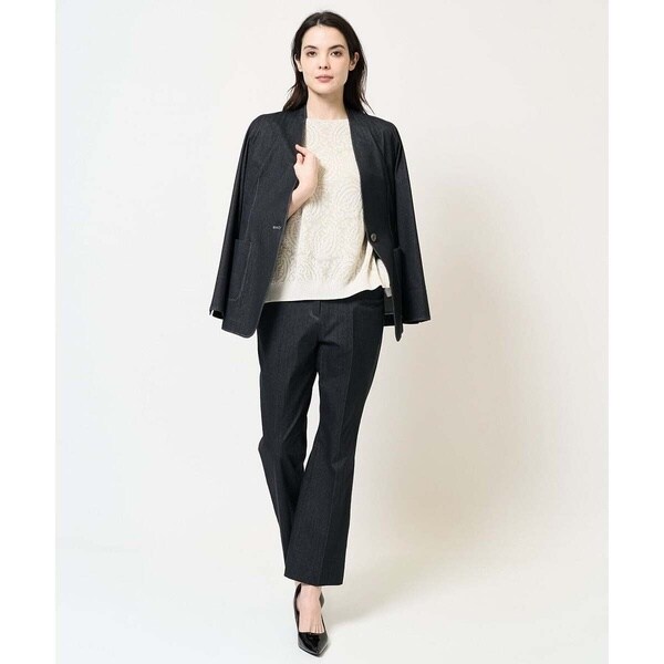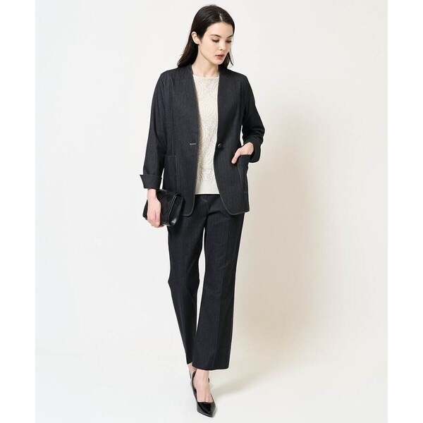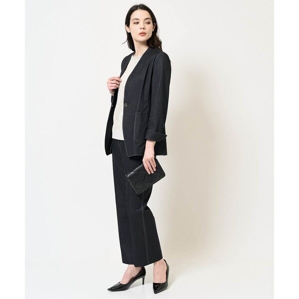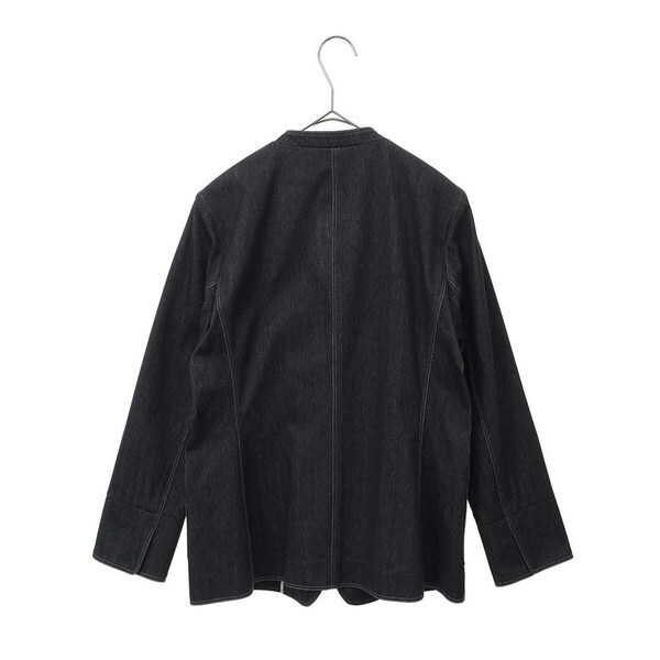 首元に沿って立体的に立ち上がるノーカラーの襟元が美しいジャケット。