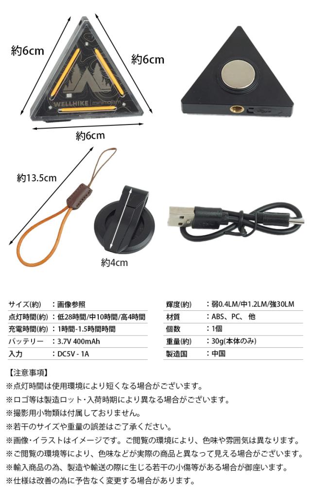 点灯時間:弱28時間/中10時間/強4時間 明るさ:弱0.4LM/中1.2LM/強30LM 入力:USB Type-C(DC5V-1A)