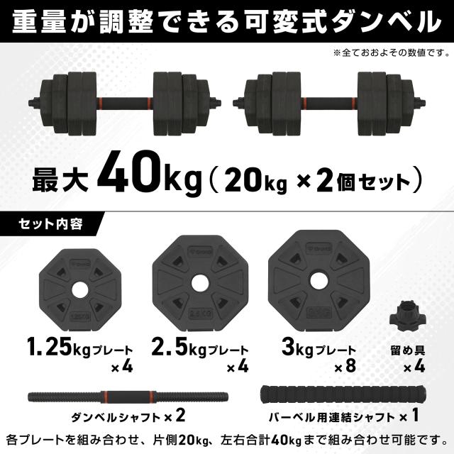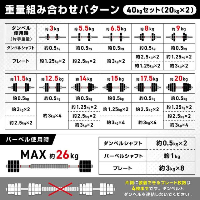 【セット内容】1.25kgプレート×4、2.5kgプレート×4、3kgプレート×4、留め具×4、ダンベルシャフト×2、バーベル用連結シャフト×2
