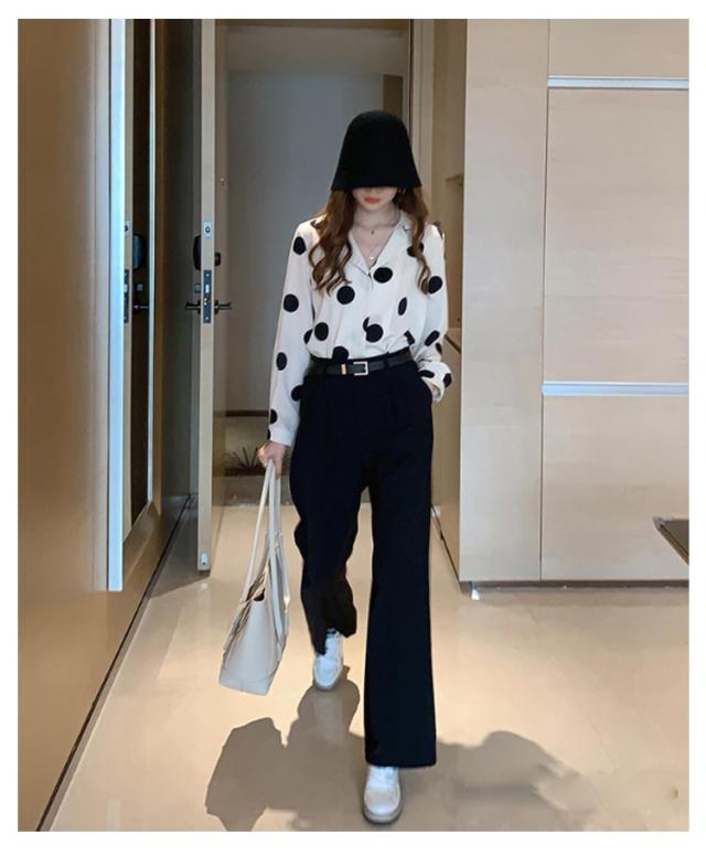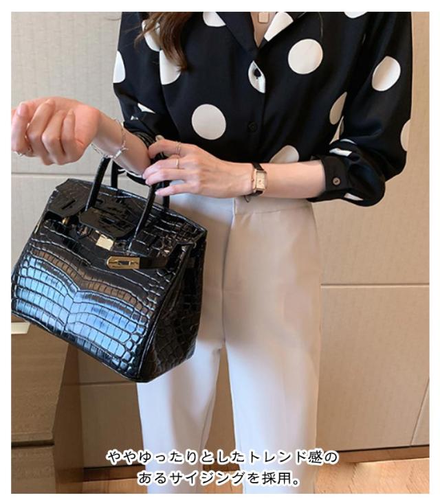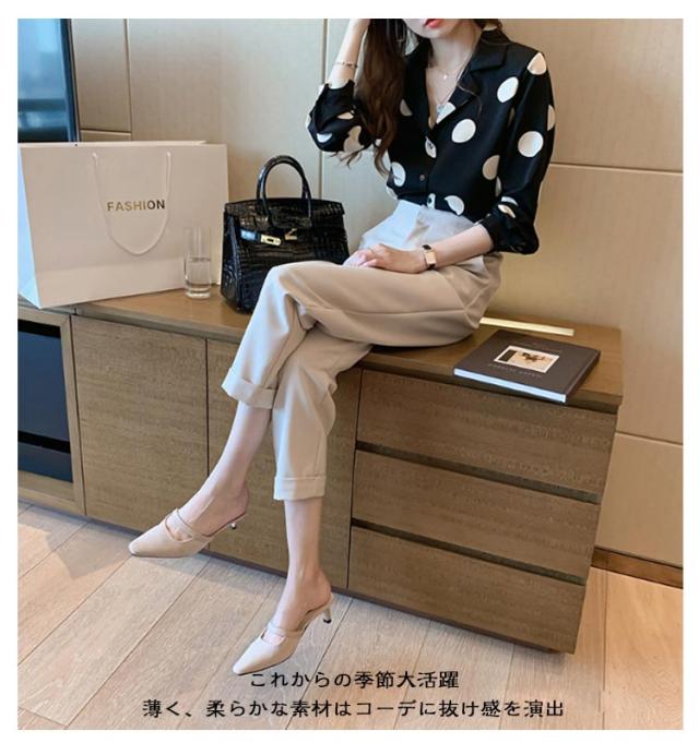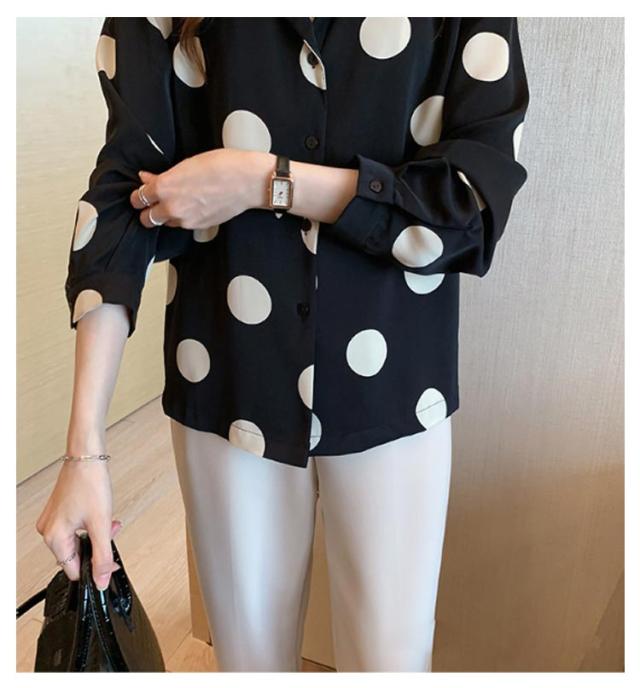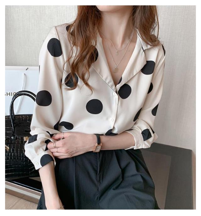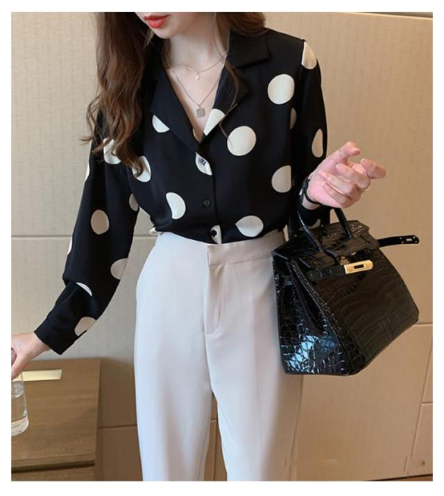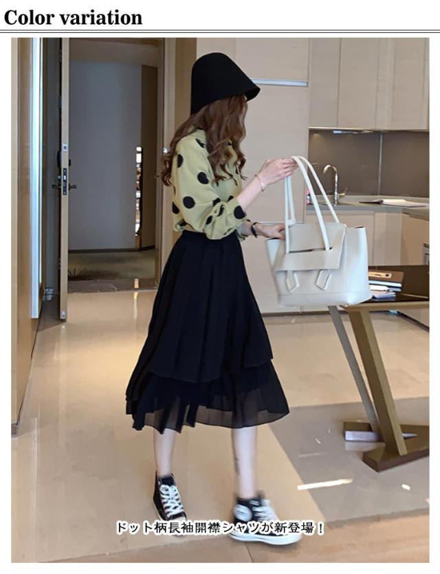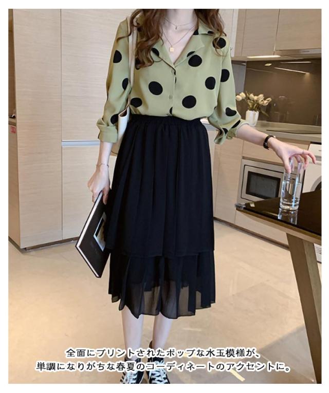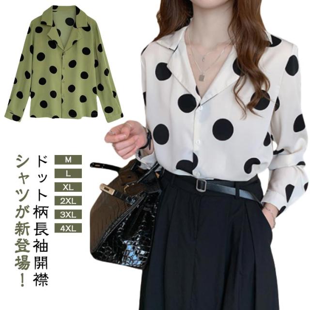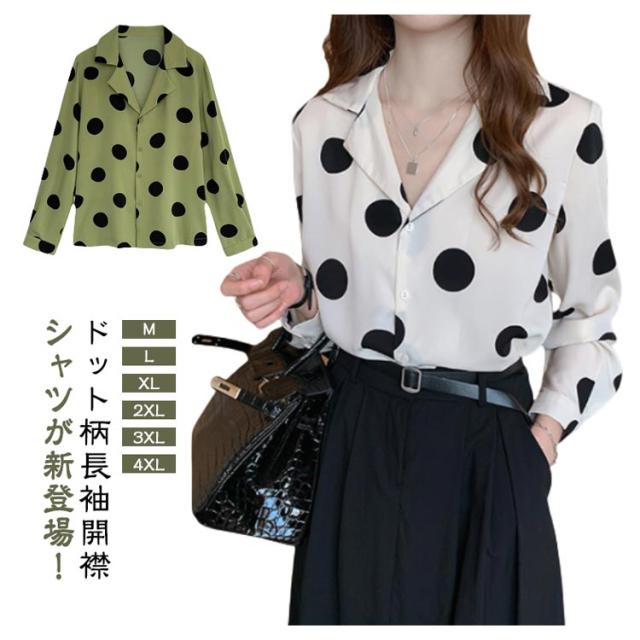 送料無料 シャツ レディース 長袖シャツ 開襟シャツ トップス ドット柄 水玉模様 襟付き オープンカラー 女性用 前開きシャツ 大きいサイズ ゆったり きれいめ おしゃれ かわいい オフィス カジュアル 総柄 OL 通勤 春 夏 秋