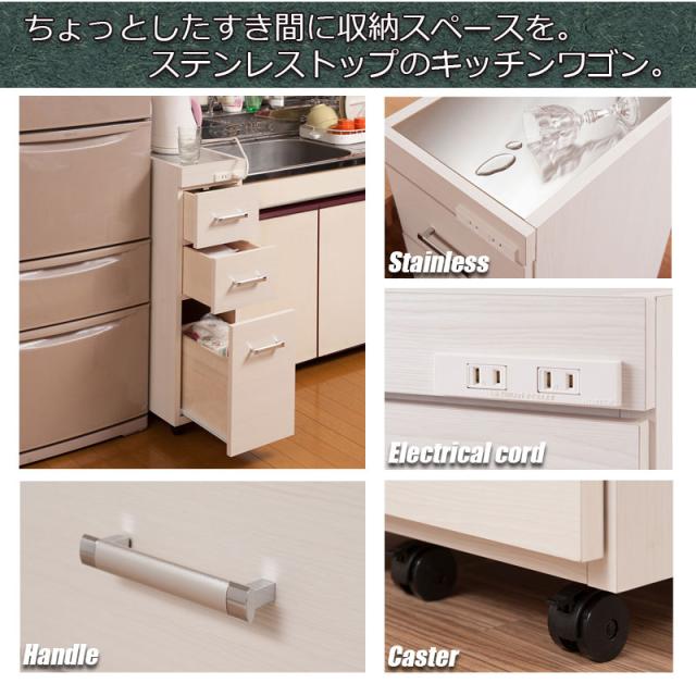 ■商品について/デッドスペースはもちろん隙間を有効活用できる『Sinker』シリーズ。今まで足りなかった作業スペースや収納スペースをこれ1台で解決!ストレスなく料理ができる、うれしいキッチンアイテム。キッチンだけでなくデスクサイドやランドリーにもあらゆるシーンに対応。取っ手は持ち手部にマットなアルミ材を使用し高級感あります。ステンレストップで水に強く、機能ともに優秀なカウンターワゴンです。