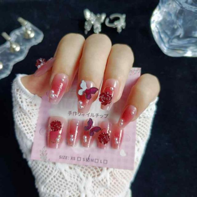 赤ワインの蝶:薄いワインレッドのメインカラーに、ワインレッドの立体的な蝶とバラを飾り、パールをあしらい、短い台形の爪で、爪全体のデザインはとてもロマンチックで、女性の気質を表している。