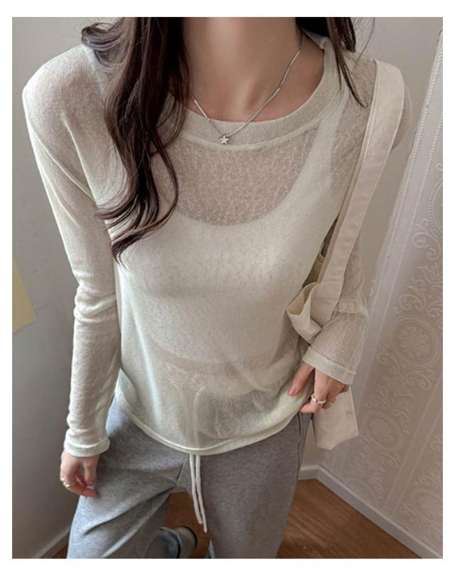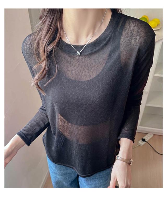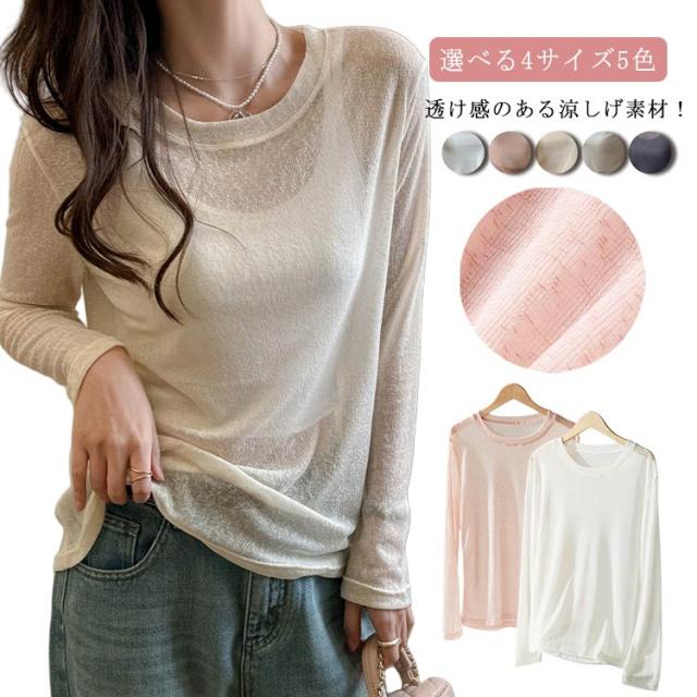 夏 透け感 シアートップス シアートップス 長袖 UVカット シアー 涼しい トップス レディース ラウンドネック 無地 重ね着