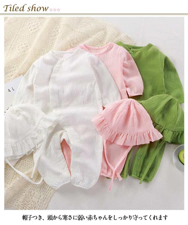 | 【ロンパース+帽子の2点セット】【66/73/80/90cm】【3色】 帽子つき、頭から寒さに弱い赤ちゃんをしっかり守ってくれます 洗いをかけたふんわりやわらかな綿のダブルガーゼ素材は、生まれたばかりの敏感肌ベビーにも嬉しい。出産祝いや退院着に大人気! 普段使いからちょっとしたお出かけまで幅広くご活用頂けます。記念日写真にもおすすめです。 前開き及び股の部分は全てスナップボタン式になっておりますのでおむつスムーズにお取替えいただけます 。 お子様の誕生日やご出産祝いなどのギフトにも最適です。 | |