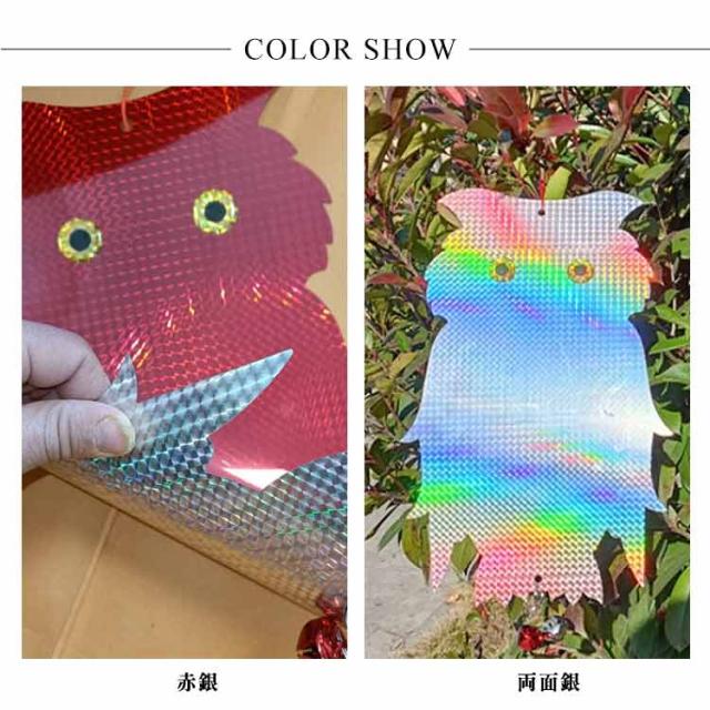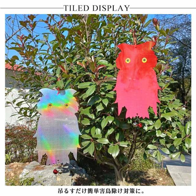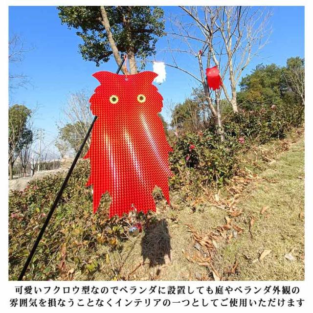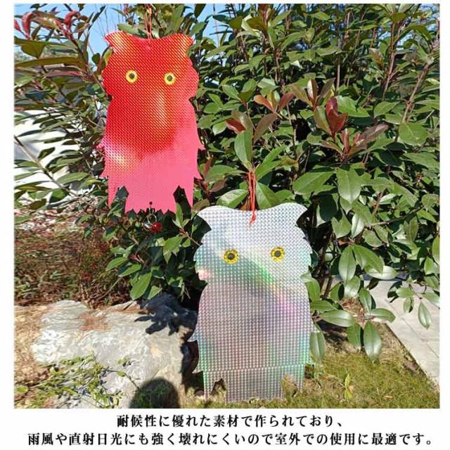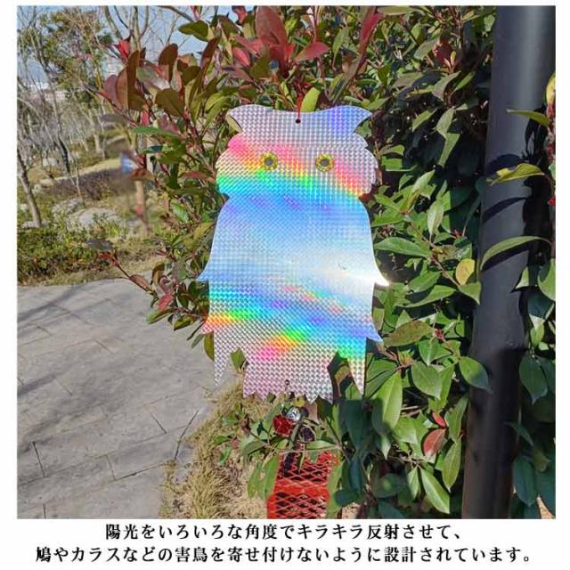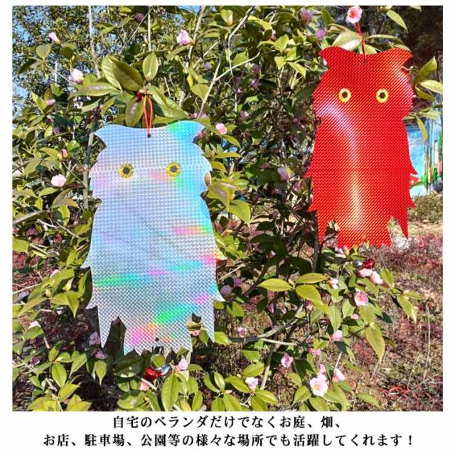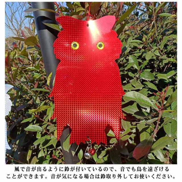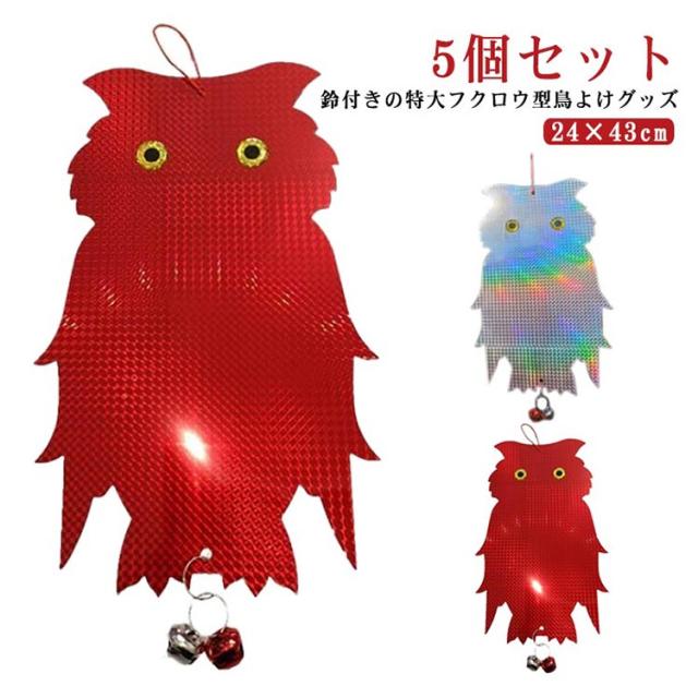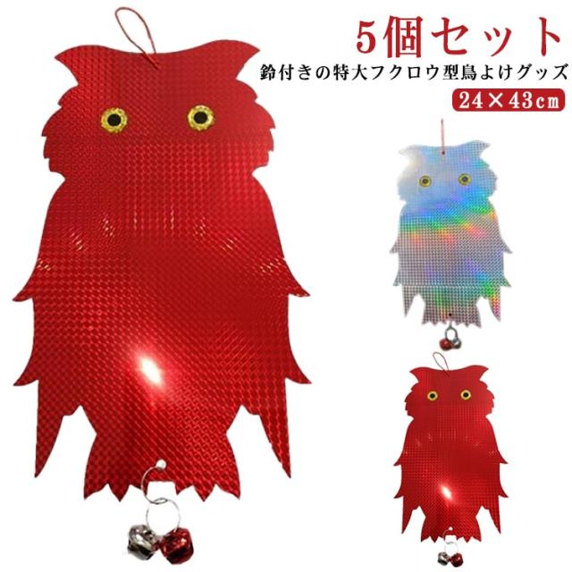 | 鈴付きの特大フクロウ型鳥よけグッズ 5個セット 吊るすだけ簡単害鳥除け対策に。 陽光をいろいろな角度でキラキラ反射させて、鳩やカラスなどの害鳥を寄せ付けないように設計されています。 風で音が出るように鈴が付いているので、音でも鳥を遠ざけることができます。音が気になる場合は鈴取り外してお使いください。 耐候性に優れた素材で作られており、雨風や直射日光にも強く壊れにくいので室外での使用に最適です。 可愛いフクロウ型なのでベランダに設置しても庭やベランダ外観の雰囲気を損なうことなくインテリアの一つとしてご使用いただけます。 自宅のベランダだけでなくお庭、畑、お店、駐車場、公園等の様々な場所でも活躍してくれます! | |