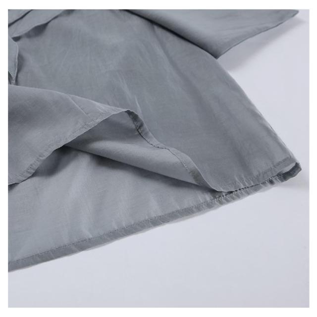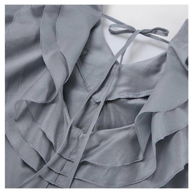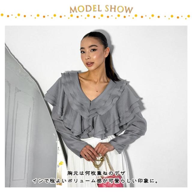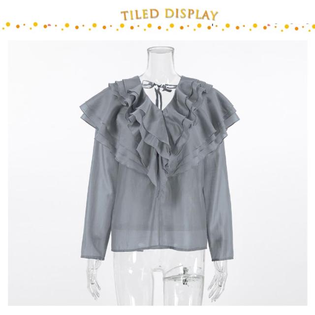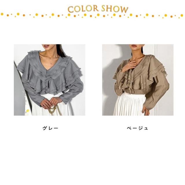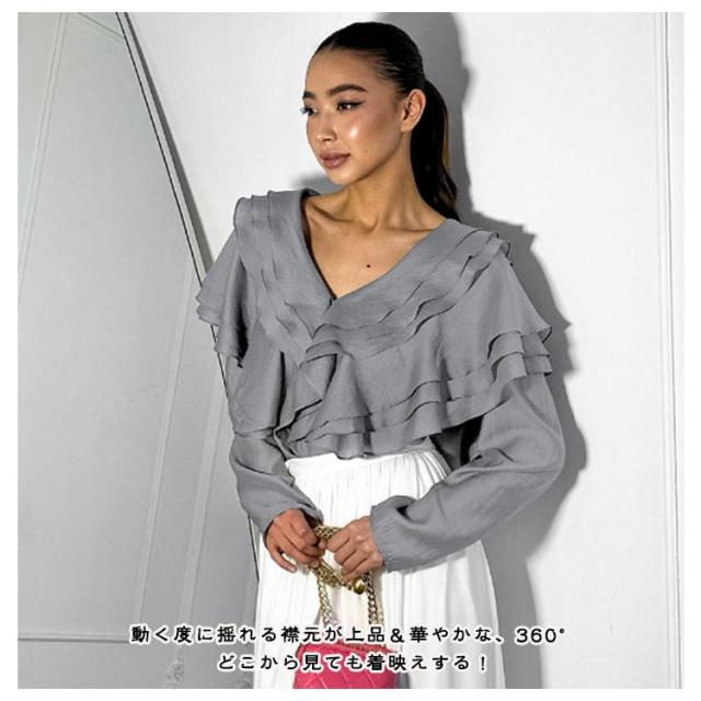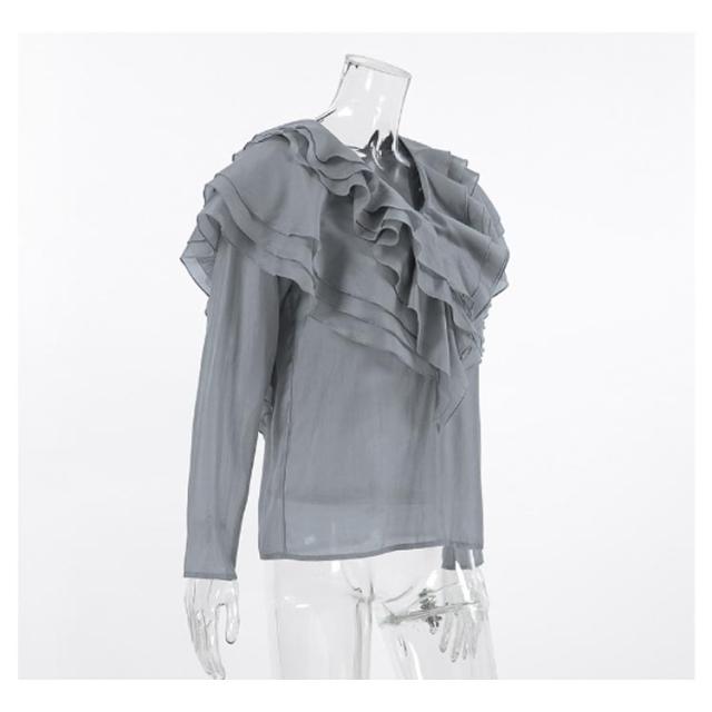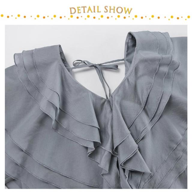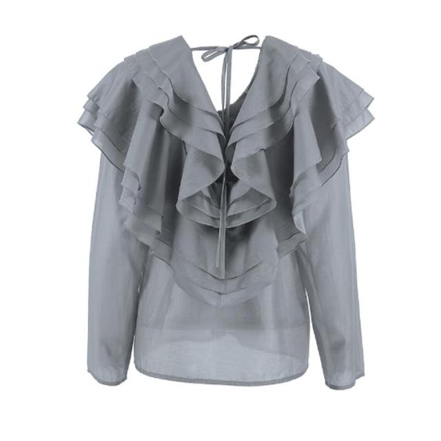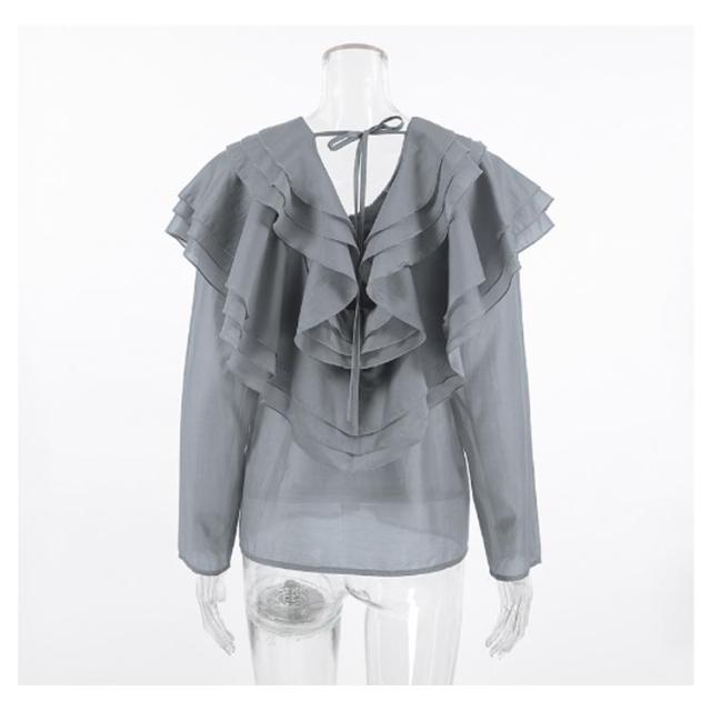襟 上品 ブラウス 長袖 レディース ブラウス フリル きれいめ フェミニン 肩フリル ビッグカラー ティアード フリル レース トップス ビッグカラー 上品 大人カジュアル 涼しい ゆったり レトロ 仕事 オフィス グレー