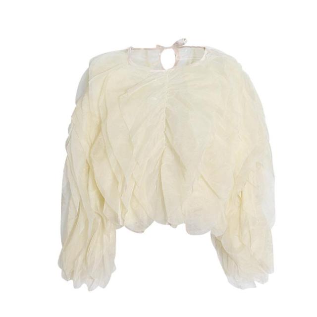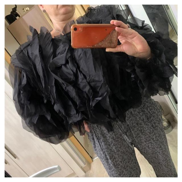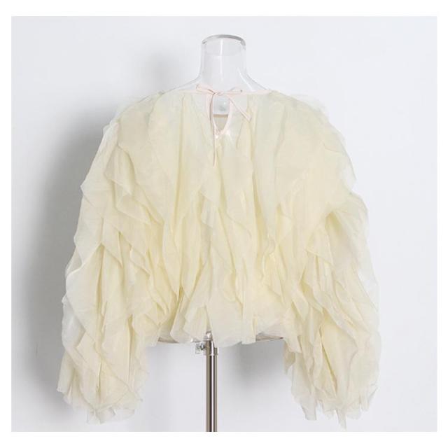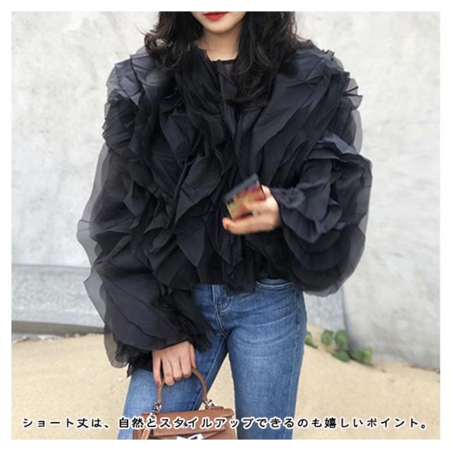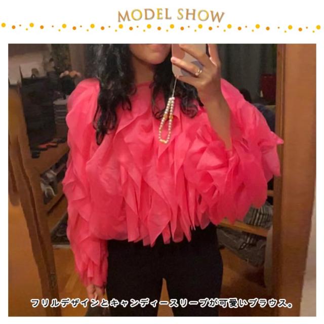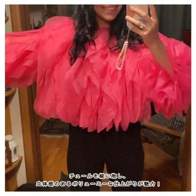 | 華やかなチュールが目を惹く、今年注目のチュール素材を使用した1枚。 フリルデザインとキャンディースリーブが可愛いブラウス。 チュールを縦に施し、立体感のあるボリューミーな仕上がりが魅力! ショート丈は、自然とスタイルアップできるのも嬉しいポイント。 すっきりとしたデザインのタイトスカートやパンツとの合わせがおすすめです。 | |
