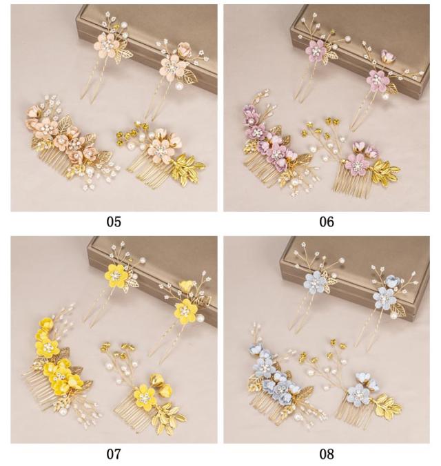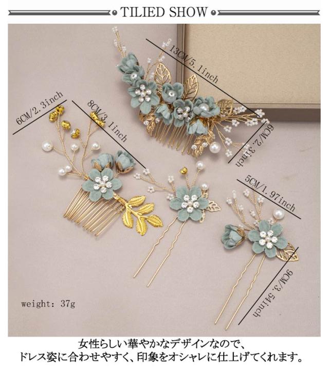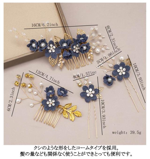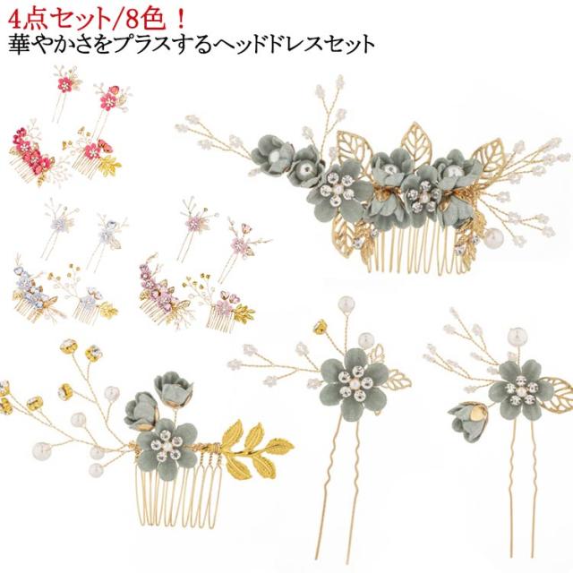 | 4点セット/8色! 華やかさをプラスするヘッドドレスセット 女性らしい華やかなデザインなので、ドレス姿に合わせやすく、印象をオシャレに仕上げてくれます。 クシのような形をしたコームタイプを採用。髪の量なども関係なく使うことができとっても便利です。 ウェディング・和装・パーティーなど様々なシーンでご使用いただけます。 | |
