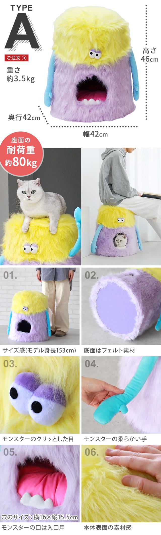 モンスターをモチーフにしたユーモアのあるデザインが目を惹く、ペット用ベッドの登場です。カラフルで存在感のあるアイテムでインテリアのアクセントにもなります。猫が落ち着くドーム型。中には取り外し可能なふわふわクッション入りで、猫ちゃんのくつろぎタイムを快適にサポートします。