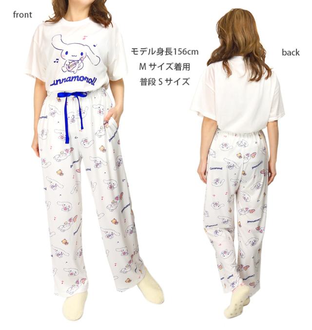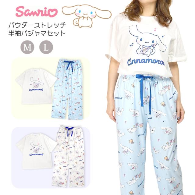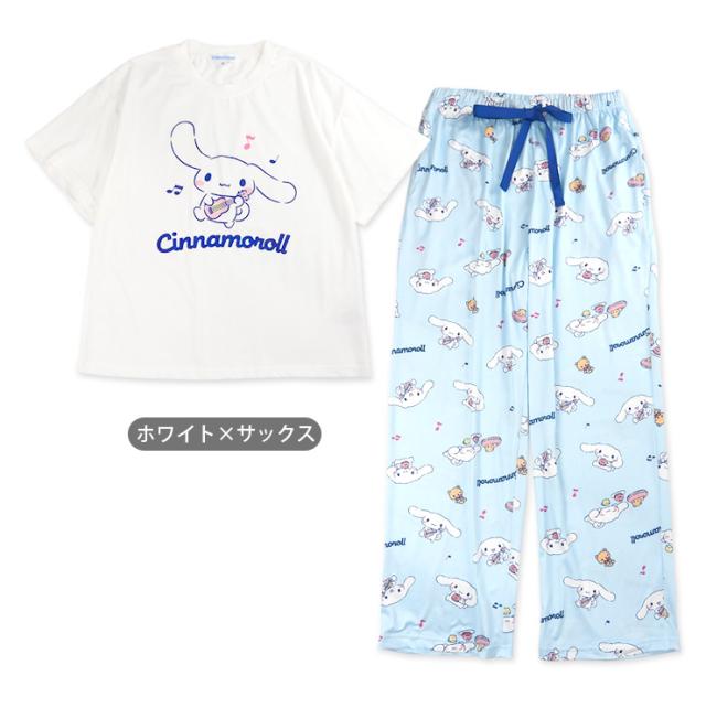 【メール便送料無料】Sanrio Cinnamoroll パウダーストレッチ 半袖 パジャマ 上下セットアップ レディース 春夏 ホワイト サックス M L SAN-1789 サンリオ シナモロール シナモン ルームウェア 部屋着 Tシャツ プルオーバー 丸首 長ズボン ロングパンツ キャラクター 2937