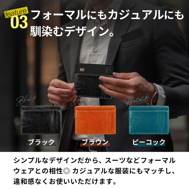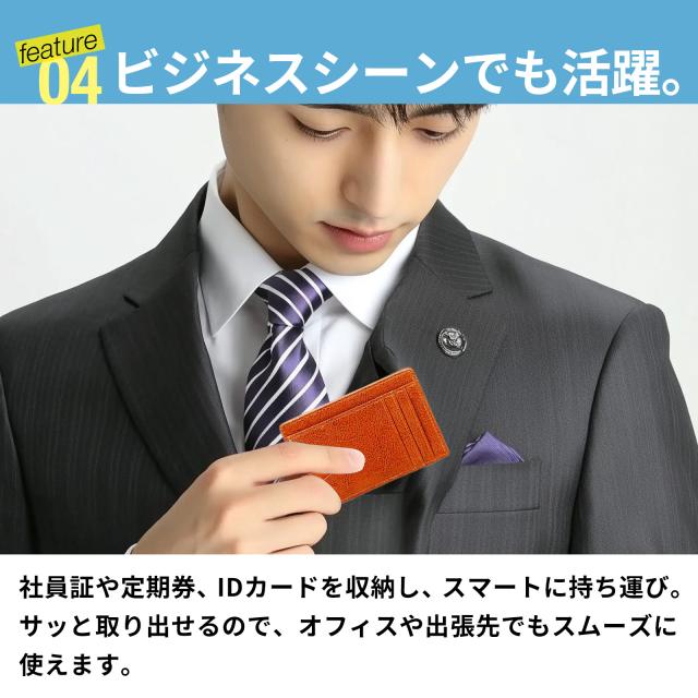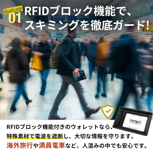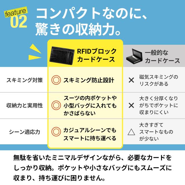 [ スキミング防止機能を備えたRFIDケース ] 【 優れた5つの ポイント 】 (1) スキミング防止で安心ガード (2) コンパクトで持ち運びラクラク (3) シンプルデザインでどんな服装にもマッチ (4) ビジネスシーンでの使いやすさ (5) ミニマルデザインでスタイリッシュ 【 スキミング防止で安心ガード 】 RFIDブロック機能が電波を遮断し、クレジットカードや電子マネーの不正利用を防ぎます。 海外旅行や混雑した場所でも安心です。 【 コンパクトで持ち運びラクラク 】 スーツの内ポケットや小型バッグにもすっきり収まるスリム設計。 必要なカードをしっかり収納しながら、かさばりません。 【 シンプルデザインでどんな服装にもマッチ 】 フォーマルにもカジュアルにも合う洗練されたデザイン。シーンを選ばず、スマートに持ち運べます。 【 ビジネスシーンでの使いやすさ 】 社員証や定期券をサッと取り出せるので、通勤やオフィスでの使用にも便利。 出張やビジネスシーンでも活躍します。 【 ミニマルデザインでスタイリッシュ 】 無駄を省いたシンプルなデザインながら、機能性も抜群。 洗練されたデザインで、持つだけでスマートな印象を演出します。 |