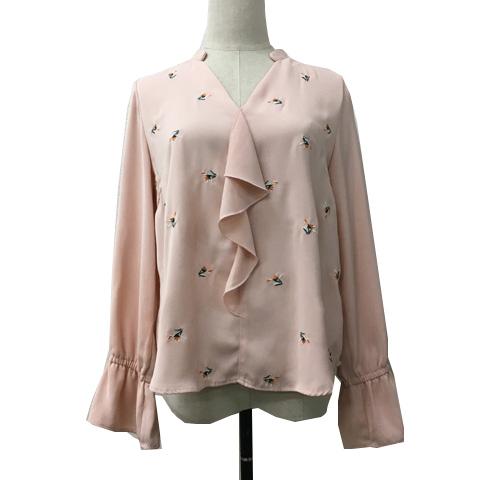 【中古】ビス ブラウス シャツ プルオーバー スキッパー フリル 刺繍 花柄 キャンディースリーブ 長袖 F ピンク 緑